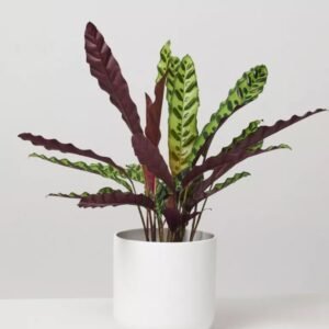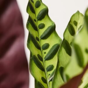 Calathea Pin Stripe or Calathea Ornata are tropical plants with pink pinstripes decorating their large waxy deep green and maroon coloured leaves, which beautifully dance according to the circadian rhythm.